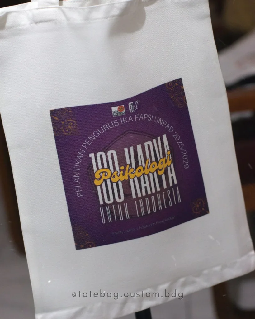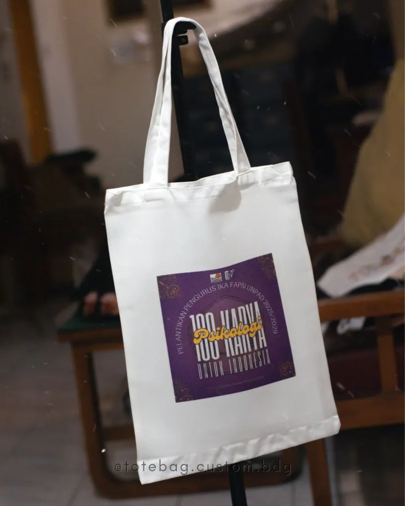 Kami menyediakan totebag kanvas custom Bandung dengan bahan kanvas berkualitas, jahitan rapi, dan hasil cetak desain yang tajam. Cocok untuk logo organisasi, desain artwork, hingga kebutuhan promosi perusahaan. Totebag kanvas juga dikenal lebih ramah lingkungan karena dapat digunakan berulang kali, menjadikannya solusi tepat untuk menggantikan kantong plastik sekali pakai.